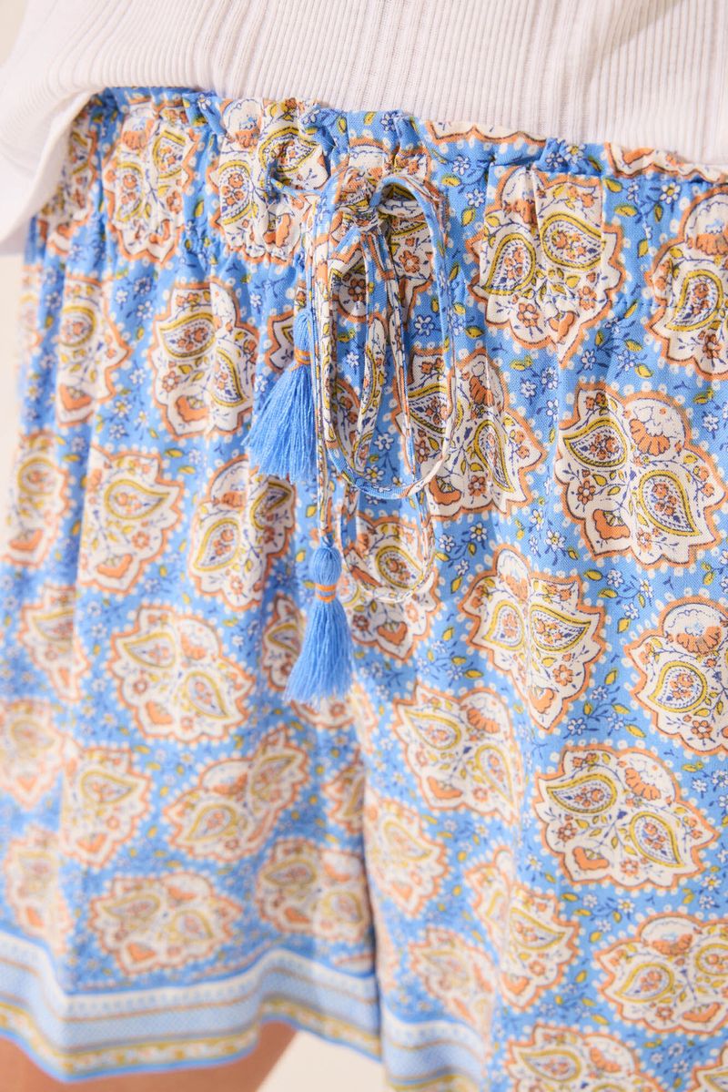 Short con estampado allover en tonos azules, ideal para looks relajados. Pretina elástica regulable con cinturón del estampado con borlas y detalle de cenefa en el ruedo.